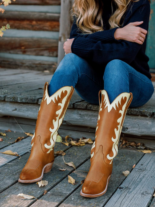 Brown Almond-Toe White Inaly Wide Mid Calf Tall Cowgirl Boots