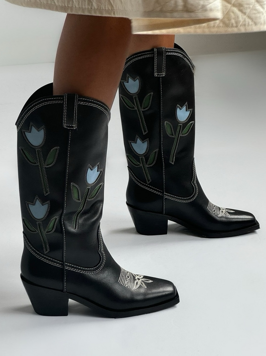 Black Square-Toe Floral Inlay Mid Calf Cowgirl Boots
