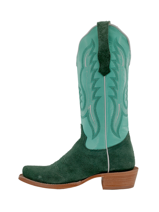 Contrast Teal Green And Brown Faux Suede Square-Toe Embroidery Mid Calf Cowgirl Boots