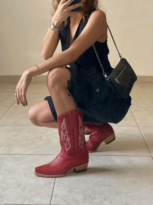 Flame Embroidery Snip-Toe Mid Calf Cowgirl Boots - Red