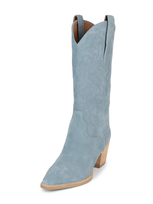 Sky Blue Faux Suede Snip-Toe Western Embroidery Mid Calf Cowgirl Boots