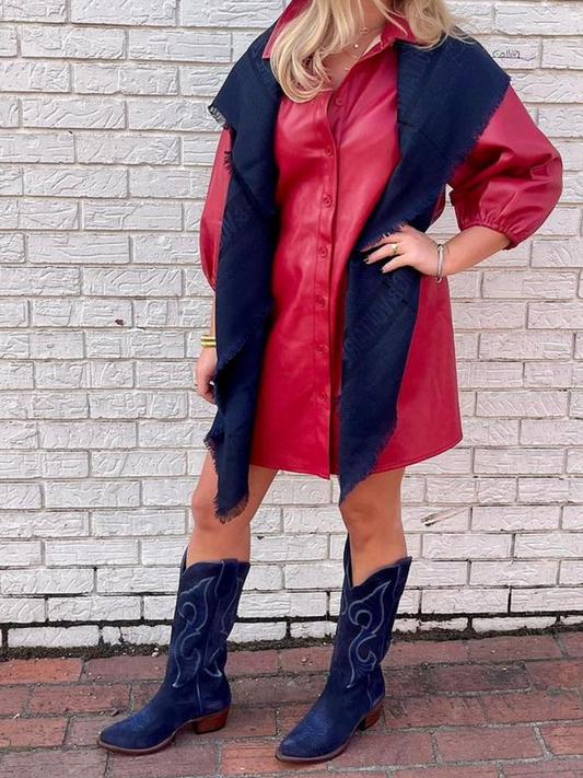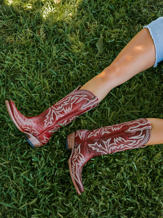 Garnet Red Snip-Toe Embroidery Wide Mid Calf Cowgirl Tall Boots