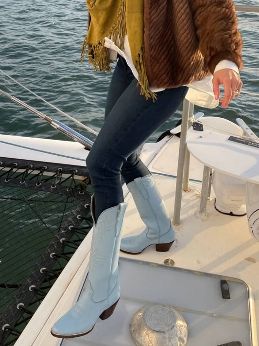 Powder Blue Vegan Leather Embroidery Almond-Toe Wide Mid Calf Tall Cowgirl Boots