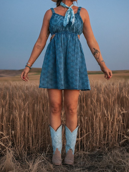 Contrast Tan Faux Suede And Powder Blue Square-Toe Embroidery Wide Mid Calf Tall Cowgirl Boots