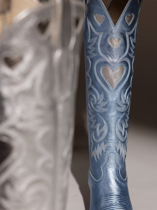 Metallic Blue Round-Toe Chic Hearts Inlay Wide Calf Knee High Cowgirl Boots