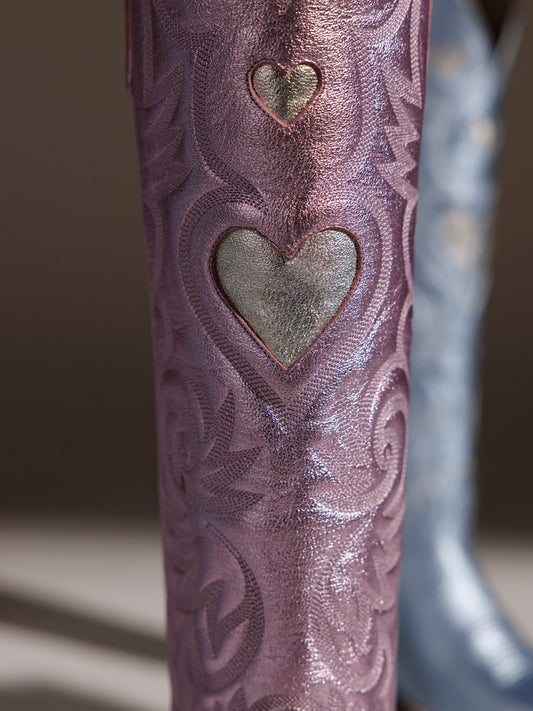 Metallic Pink Round-Toe Chic Hearts Inlay Wide Calf Knee High Cowgirl Boots