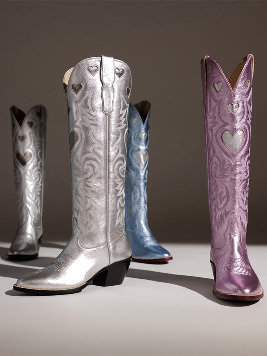 Metallic Silver Round-Toe Chic Hearts Inlay Wide Calf Knee High Cowgirl Boots