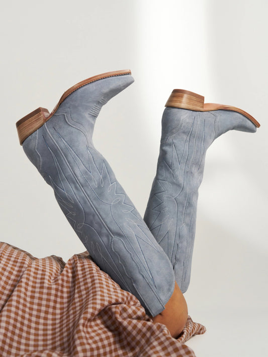 Blue Faux Suede Snip-Toe Stitch Wide Calf Knee High Cowgirl Boots