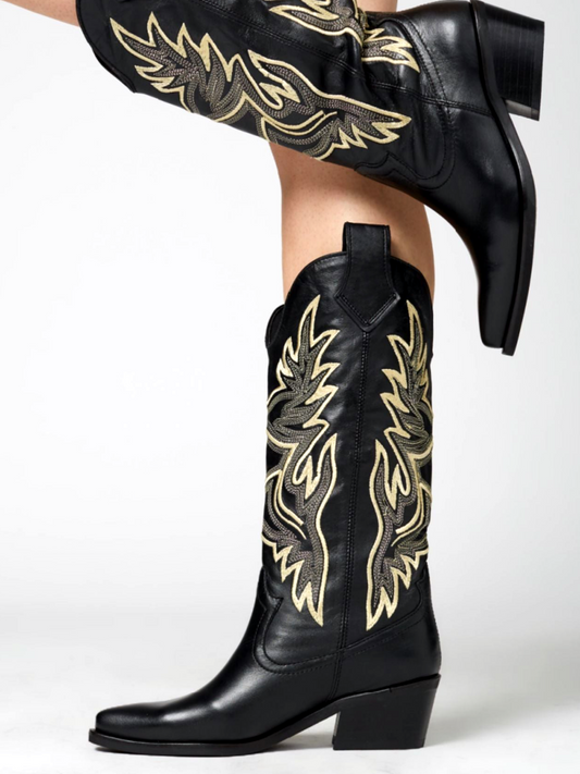 Black Snip-Toe Star Embroidery Wide Mid Calf Tall Wetsern Boots For Women