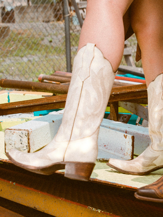 Bone Embroidery Tall Snip-Toe Wide Mid Calf Western Boots For Women