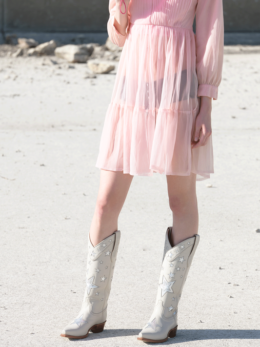 Bone Snip-Toe Metallic Silver Star Inlay Tall Wide Mid Calf Cowgirl Boots