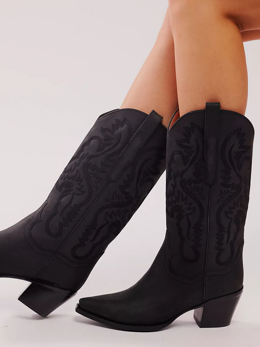 Black Snip-Toe Western Embroidery Wide Mid Calf Tall Cowgirl Boots