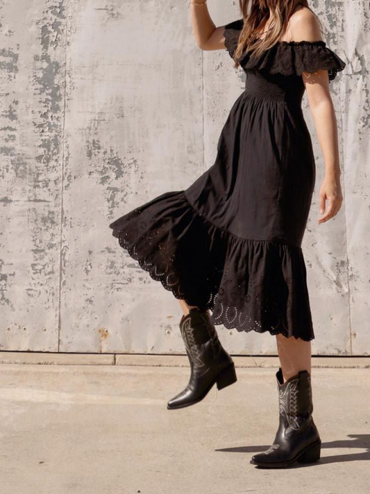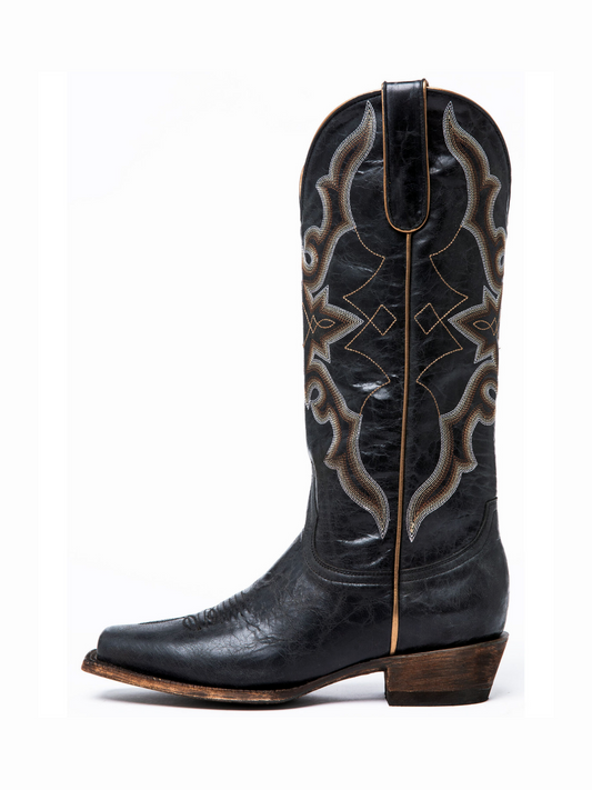Black Square-Toe Embroidery Tall Wide Mid Calf Cowgirl Boots