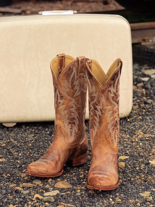 Distressed Classic Embroidery Snip-Toe Wide Mid Calf Tall Cowgirl Boots - Tan