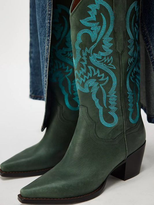 Dark Green Snip-Toe Turquoise Embroidery Wide Mid Calf Tall Cowgirl Boots
