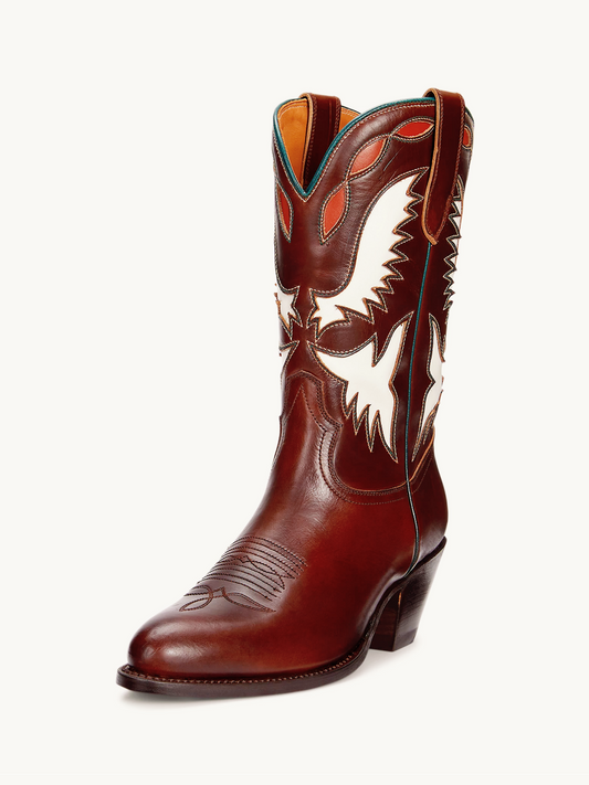 Dark Brown Almond-Toe Cream Wings Inlay Applique Wide Mid Calf Tall Cowgirl Boots