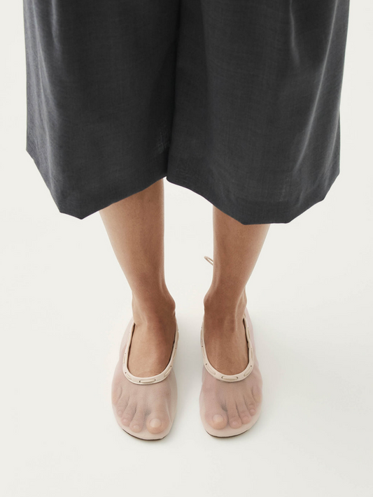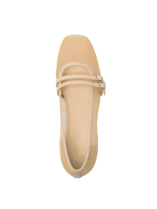 Nude Square Toe Semi-Transparent Mesh Ballet Flats With Double Buckled Strap