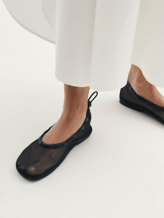 Drawstring Round-Toe Ballet Flats In Black Mesh
