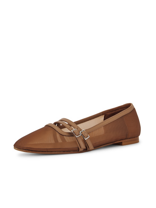 Brown Square Toe Semi-Transparent Mesh Ballet Flats With Double Buckled Strap