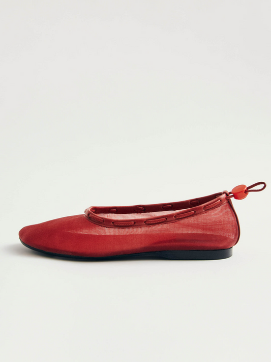 Drawstring Round-Toe Ballet Flats In Red Mesh