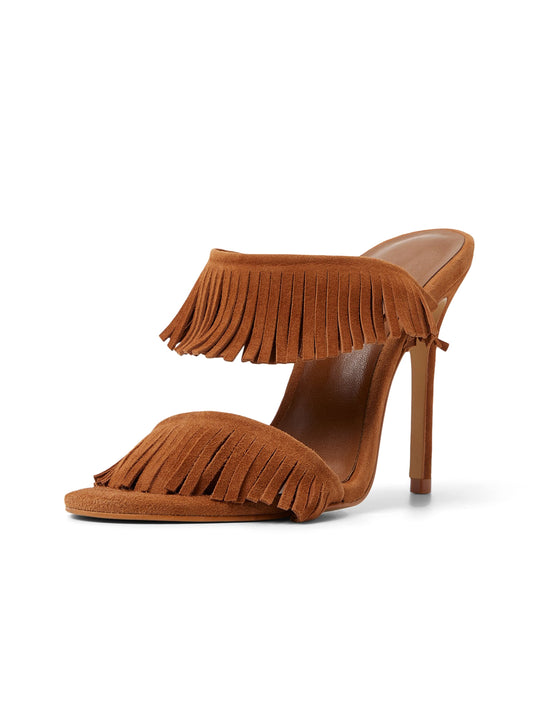 Brown Faux Suede Open Round-Toe Fringe High Heels