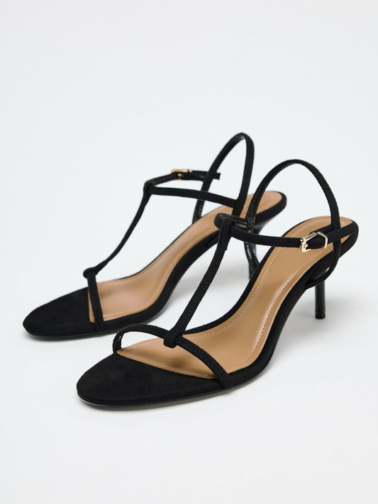 Black Faux Suede Round-Toe Front And Ankle Strap Kitten Heel Sandals