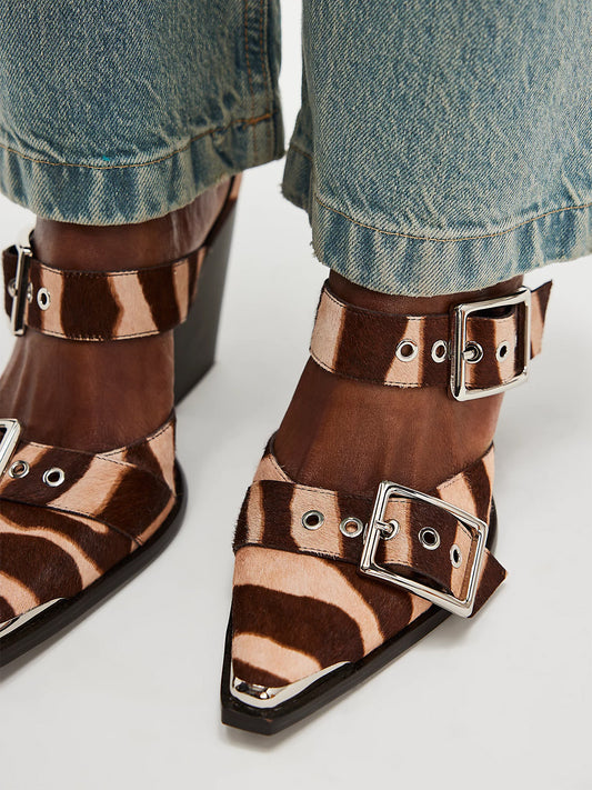 Pointed-Toe Three Buckled Straps Back Zip Chunky High Heels - Zebra