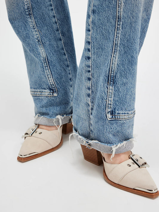Pointed-Toe Three Buckled Straps Back Zip Chunky High Heels - Natural