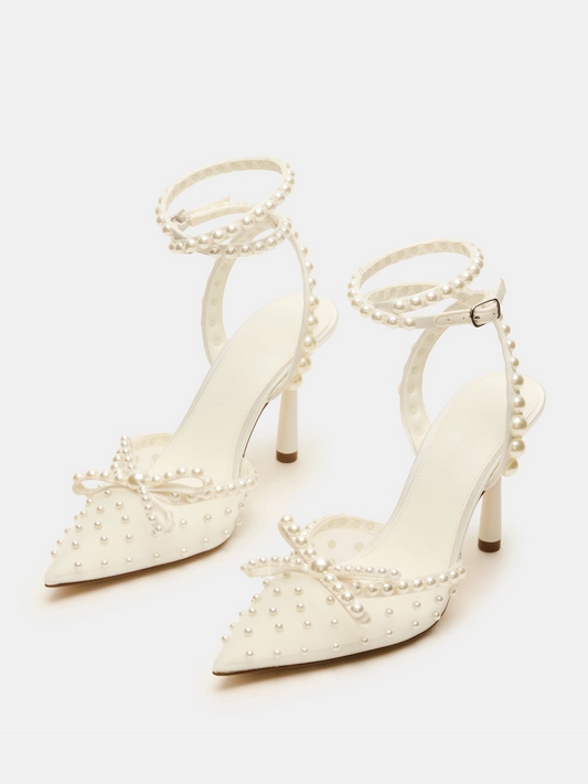 Ivory Mesh Pointed-Toe Pearls Pump High Heels With Ankle Strap