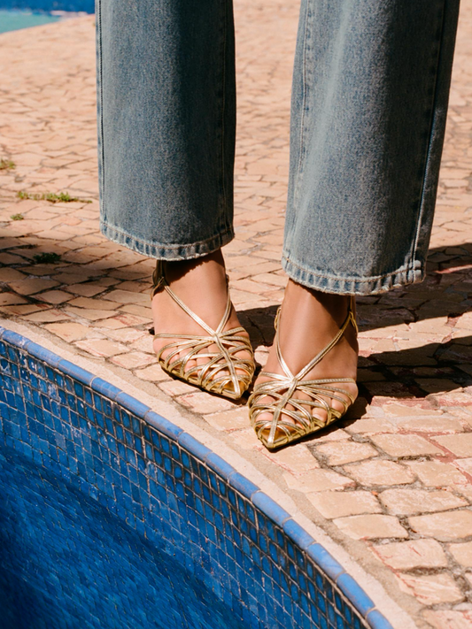 Metallic Gold Woven Pointed-Toe Slingback Kitten Heels