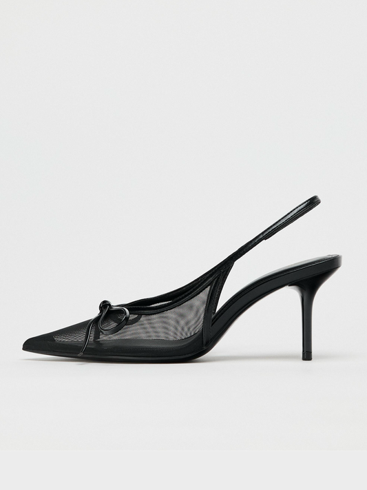 Black Mesh Pointed-Toe Slingback Pump High Heels With Bow