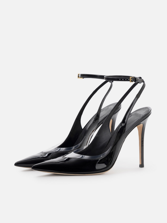 Patent Black And Transparent TPU Film Pointed-Toe Slingback Ankle Strap Pump High Heels