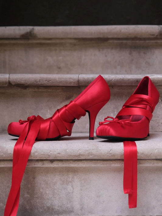 Red Satin Square-Toe Ankle Strap Pump High Heels With Bow