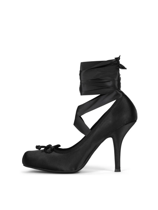 Black Satin Square-Toe Ankle Strap Pump High Heels With Bow