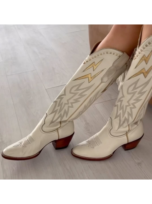 Metallic Gold Lightning Inlay Stitch Embroidery Almond-Toe Knee High Tall Cowgirl Boots - Bone