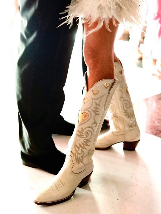 Metallic Gold Heart Inlay Embroidery Almond-Toe Tall Wide Calf Knee High Cowgirl Boots - Bone