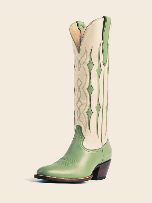 Green Contrast Inlay Stitch Almond-Toe Wide Calf Western Knee High Cowgirl Boots