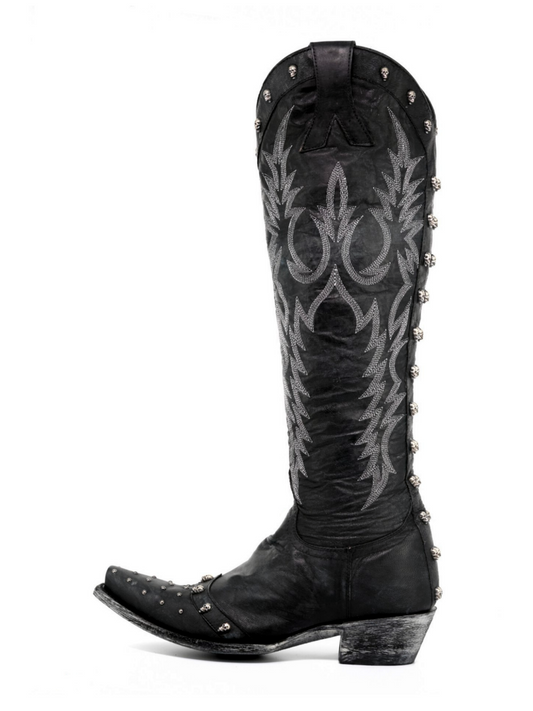 Black Snip-Toe Studded Embroidery Skull Applique Half-Zip Tall Knee High Cowgirl Boots