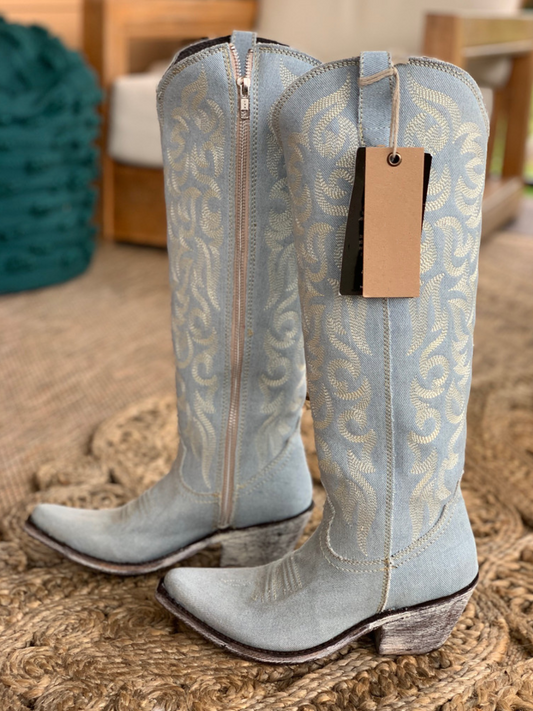 Denim Round Pointed-Toe Embroidery Full-Zip Tall Knee High Cowgirl Boots - Blue