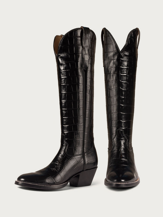 Black Crocodile-Embossed Almond-Toe Wide Calf Tall Knee High Cowgirl Boots