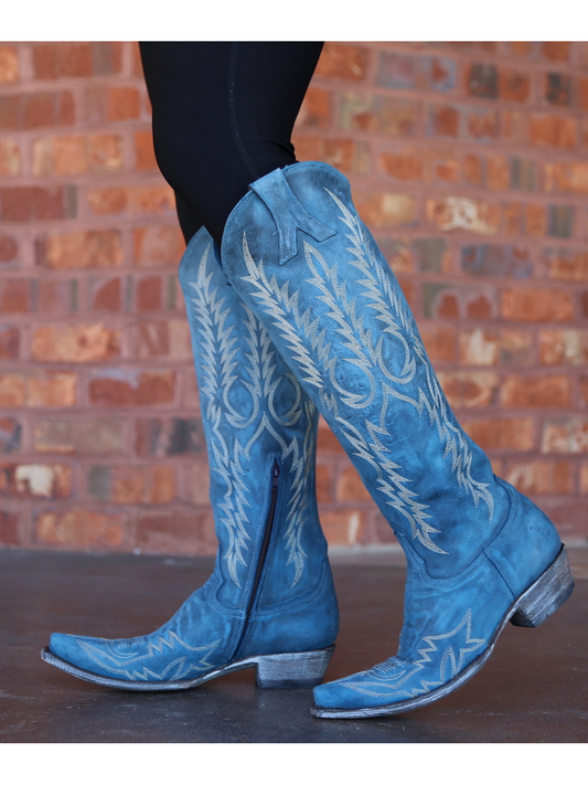Distressed Blue Snip-Toe Half-Zip Embroidery Knee High Tall Cowgirl Boots