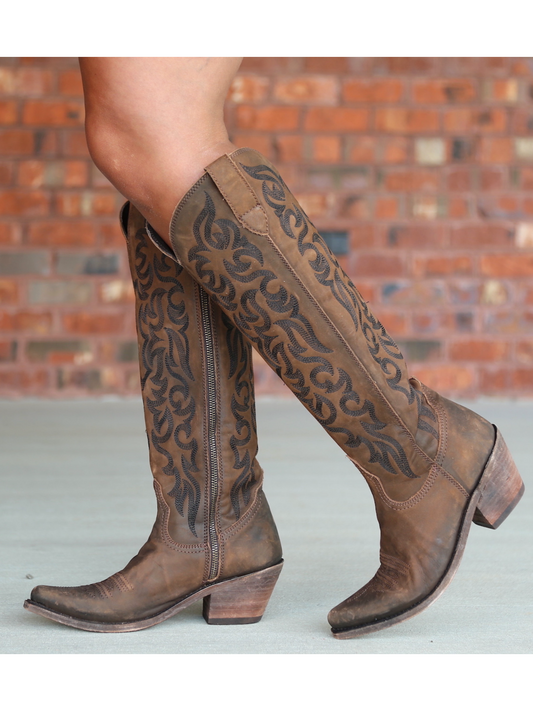 Embroidery Half-Zip Snip-Toe Tall Knee High Cowgirl Boots - Distressed Brown