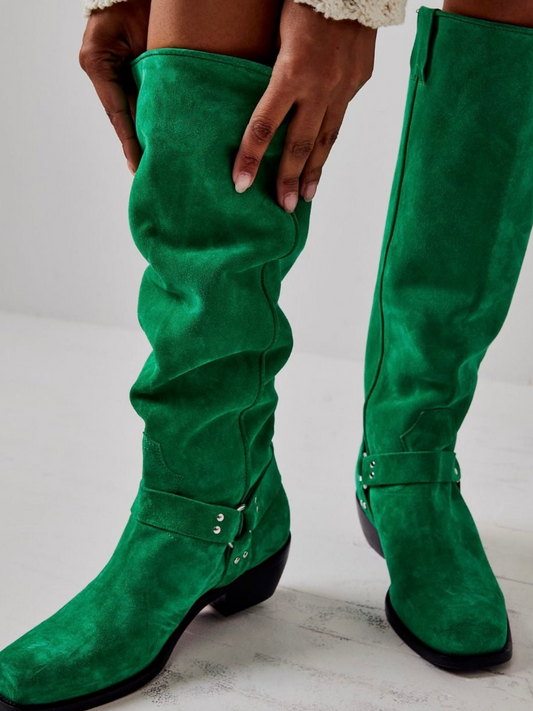 Faux Suede Square-Toe Wide Calf Tall Knee High Cowgirl Boots With Buckle - Green
