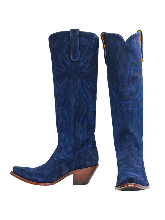 Navy Blue Embroidery Faux Suede Snip-Toe Wide Calf Cowgirl Boots Knee High Tall Boots
