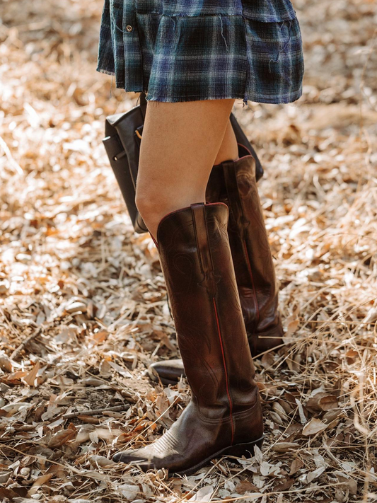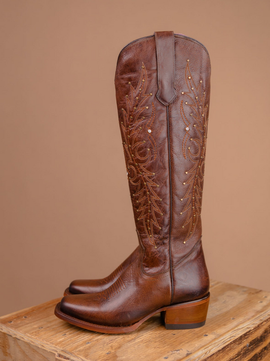 Dark Brown Almond-Toe Embroidery Wide Calf Knee High Tall Western Boots For Women