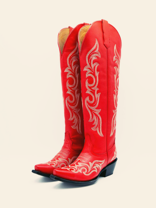 Red Embroidery Snip-Toe Wide Calf Western Boots Knee High Tall Boots