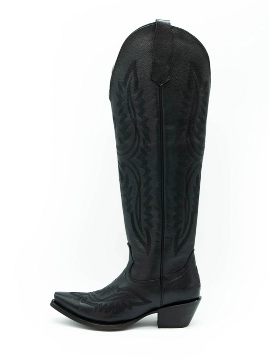 Black Embroidery Snip-Toe Tall Half-Zip Knee High Cowgirl Boots