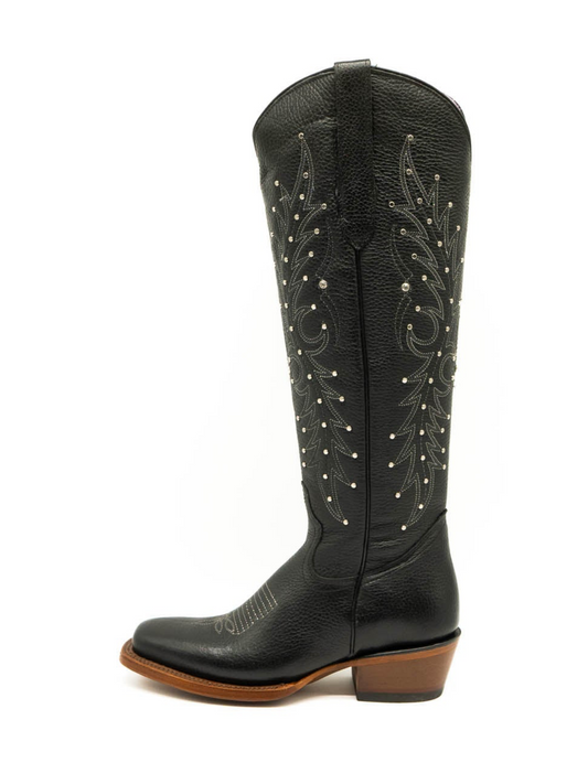 Black Pointed-Toe Studded Embroidery Wide Calf Tall Knee High Cowgirl Boots