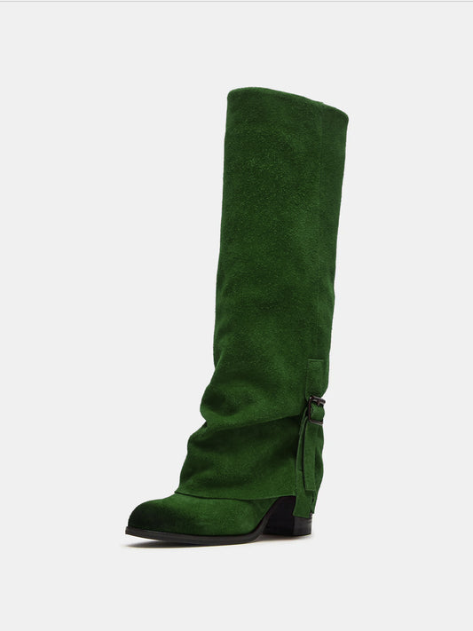 Grass Green Faux Suede Round-Toe Fold-Over Adjustable Buckle Knee High Cowgirl Boots