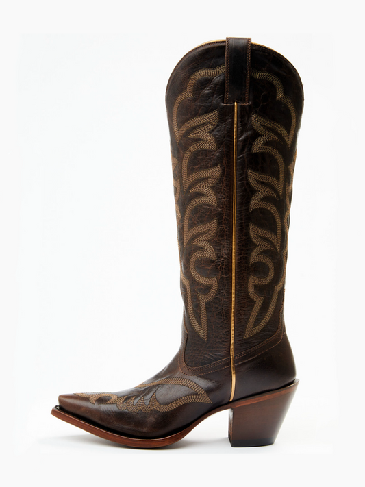 Brown Embroidery Snip-Toe Tall Wide Calf Knee High Cowboy Boots For Women